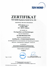2) Certifikát přezkoušení a schválení výrobce podle AD 2000 – Merkblatt HP0 pro tlaková zařízení a potrubí